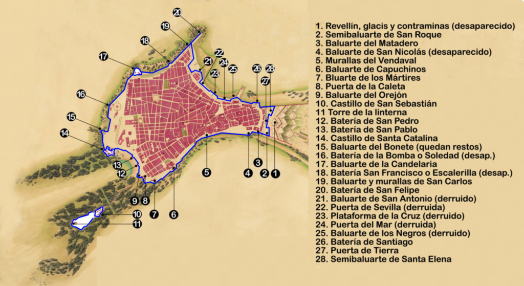 El esquema defensivo empleado era el mismo prácticamente que el de la Guerra de la Independencia, que tenía como límites en líneas generales: el caño de Sancti-Petri, el del Zurraque, el arsenal de la Carraca y el canal del Trocadero en la península de Matagorda.