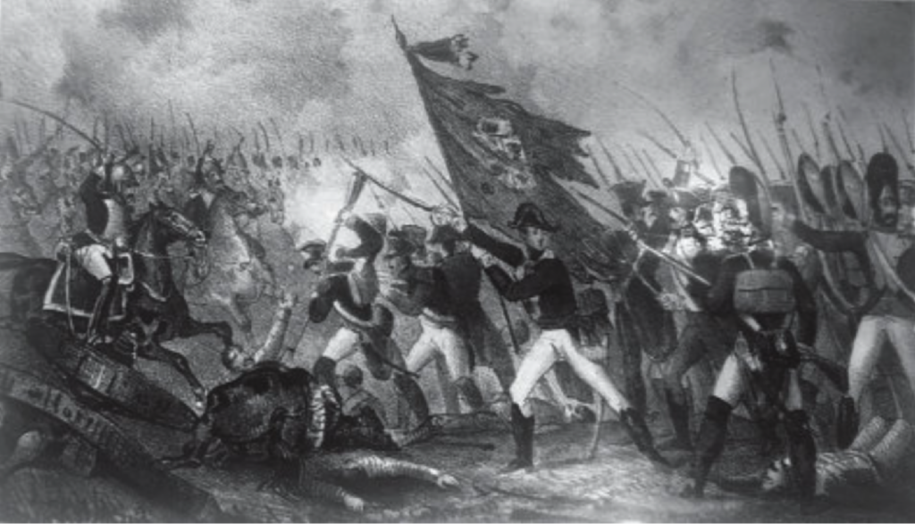 Riego, sin embargo, logró reunir algunos batallones y parte de su caballería en las alturas, al otro lado del pequeño río Jaén, cuyo cruce intentó defender con escaramuzadores. Pero fueron rechazados de inmediato, y el batallón del RI-1 de línea, al mando del propio general Bonnemains, cruzó el río sin vacilar y avanzó en el mejor orden hacia estas alturas. A su vez, contó con el apoyo del RIL-4.