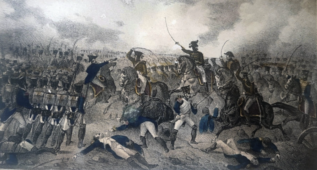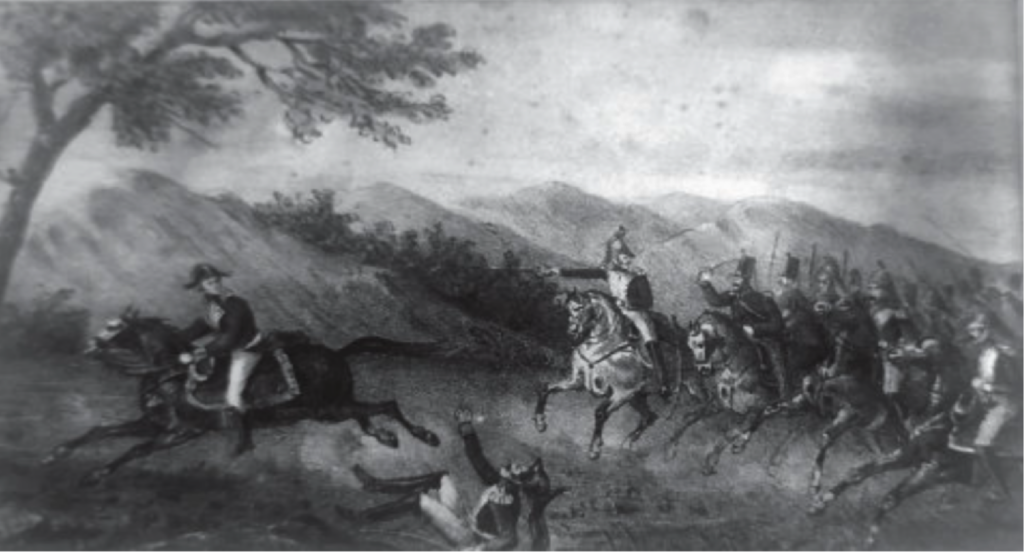 Este movimiento fue tan rápido que la caballería española no tuvo tiempo de oponerse. Se reagruparía en buen orden, bordeando un montículo donde Riego se había detenido con el batallón de avanzada, que también había formado un cuadro. Animado por el éxito de su primera carga, el primer escuadrón continuó su curso, impertérrito ante el intenso fuego a media distancia. Alcanzó a la caballería al pie del montículo y la derrotó. Los demás escuadrones de la guardia que aparecieron entonces le impidieron reagruparse.