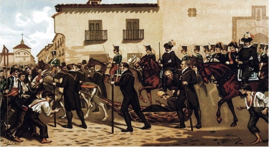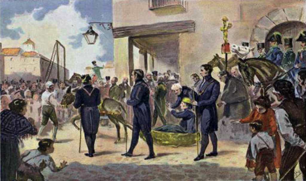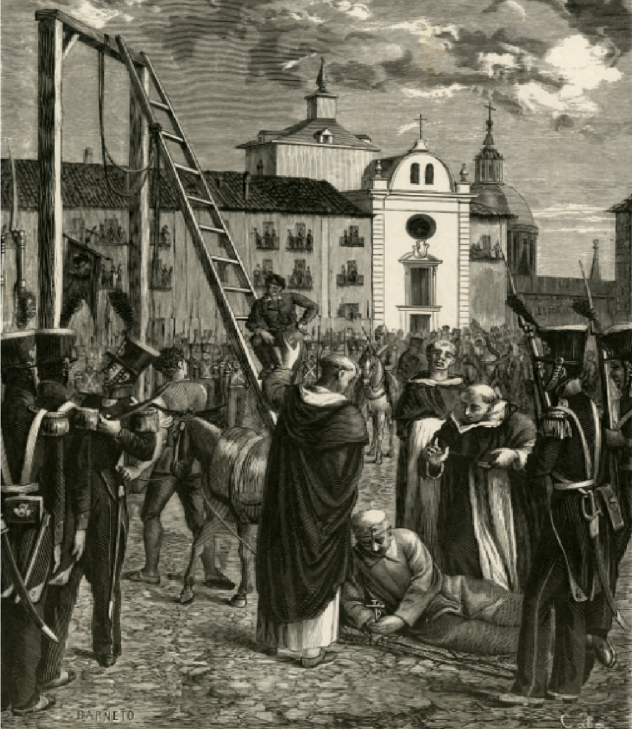 Así, la lúgubre comitiva, encabezada por una gran cruz, llegó a la Plaza de la Cebada, donde se había levantado una horca de mayor altura de las habituales para que todos pudieran ver la ejecución del general liberal.