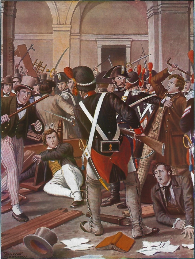 El coronel Bricherasio, que custodiaba el Palacio Real con el regimiento Piemonte Reale, creyendo que la multitud estaba a punto de invadir el palacio, los hizo cargar con bayonetas. En la refriega que siguió, una mujer murió y muchos resultaron heridos.