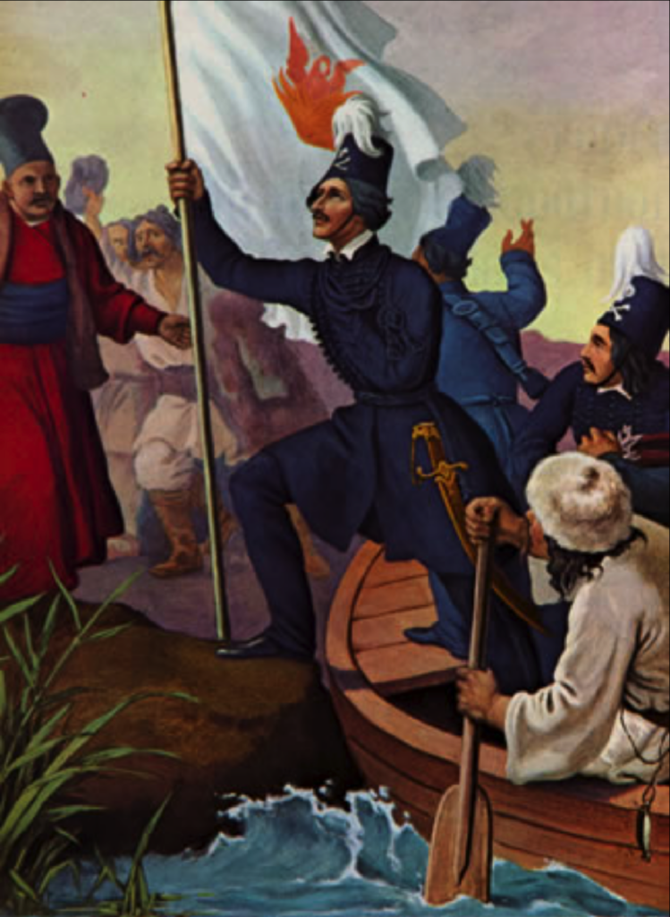 El 21 de febrero, Ypsilantis salió de Chisinau hacia el río Pruth. Ese día, un pequeño grupo liderado por Vasilis Karavias, con marineros jonios cefalónicos griegos y albaneses contratados, atacó la guarnición otomana en Galați y a los pocos musulmanes del pueblo. Al día siguiente, 22 de febrero a las 20:00 horas, Ypsilantis, con una pequeña fuerza de hombres, pasó el control de pasaportes en el río Pruth, es decir, la frontera entre el Imperio ruso y el Imperio otomano, y llegó a la cercana Iași, donde lo esperaban el gobernante Soutsos y el embajador ruso Pisanis en el monasterio de Gálata en Iași, para asegurarles que no tiene intención de derrocar el régimen existente en los dos principados, sino de reunir un ejército y marchar hacia Grecia.