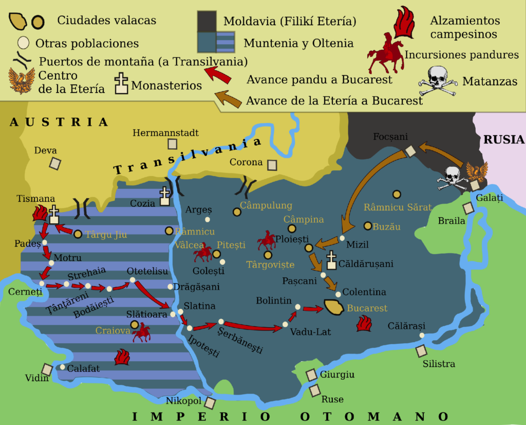 El 16 de marzo, en Bucarest, Olympios y Farmakis como precursores del rumano Tudor Vladimirescu, quien desde el 17 de enero de 1821 en Bucarest había iniciado el levantamiento campesino y a principios de marzo había dominado la Pequeña Valaquia y avanzaba hacia la Gran Valaquia. Vladimirescu, viendo el vacío de poder en la región, declaró una revolución, llamando a todos los pueblos de la región contra los otomanos y los fanariotas juntos.