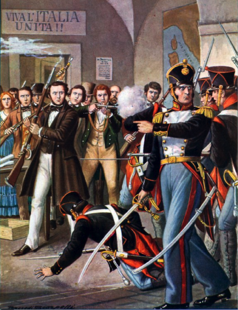 Se suponía que una insurrección estallaría el 10 de diciembre de 1830, día en que un grupo audaz de hombres ocuparía la armería papal y el Castillo de Sant’Angelo desde la Plaza de San Pedro para luego, tras armar al pueblo, proclamar la república en el Capitolio. Pero la policía fue alertada y el intento fue frustrado. Carlos Luis Napoleón (1807-73) (hijo de Luis, hermano de Napoleón Bonaparte), quien había desempeñado un papel importante en la conspiración (entonces se consideraba el líder del partido bonapartista), fue expulsado de los Estados Pontificios y se refugió en Florencia, donde se encontraba su hermano.