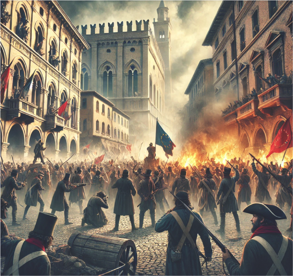 Bolonia se levanta en un movimiento revolucionario el 13 de febrero de 1831, iniciando la chispa de Risurgimiento. Realizado con IA, se observa la bandera de la UE.
