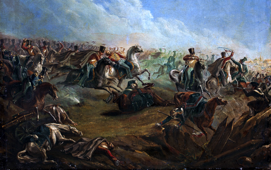 Esto salvó a la infantería de Roth, ya que la línea de fuego de la artillería polaca fue bloqueada por la caballería polaca y rusa. Ambos comandantes comprometieron más caballería en la batalla, y pronto las fuerzas de ambos bandos se equilibraron a 550 soldados de caballería en ambos lados. Ambas fuerzas pronto perdieron la cohesión, y la batalla degeneró en una serie de duelos entre los lanceros y húsares polacos (armados con lanzas y sables) y los coraceros rusos y los dragones de la Guardia (armados con sables anchos). Los polacos inicialmente obtuvieron la ventaja y lograron incapacitar al general Nostitz y rodear a los dragones de la Guardia, hiriendo gravemente a su comandante, el general von Sasse, pero luego fueron atacados por refuerzos rusos adicionales liderados por los húsares de la Guardia y obligados a retirarse. Esto obligó a algunas de las tripulaciones de artillería polaca a retirarse a las murallas de la tercera línea.