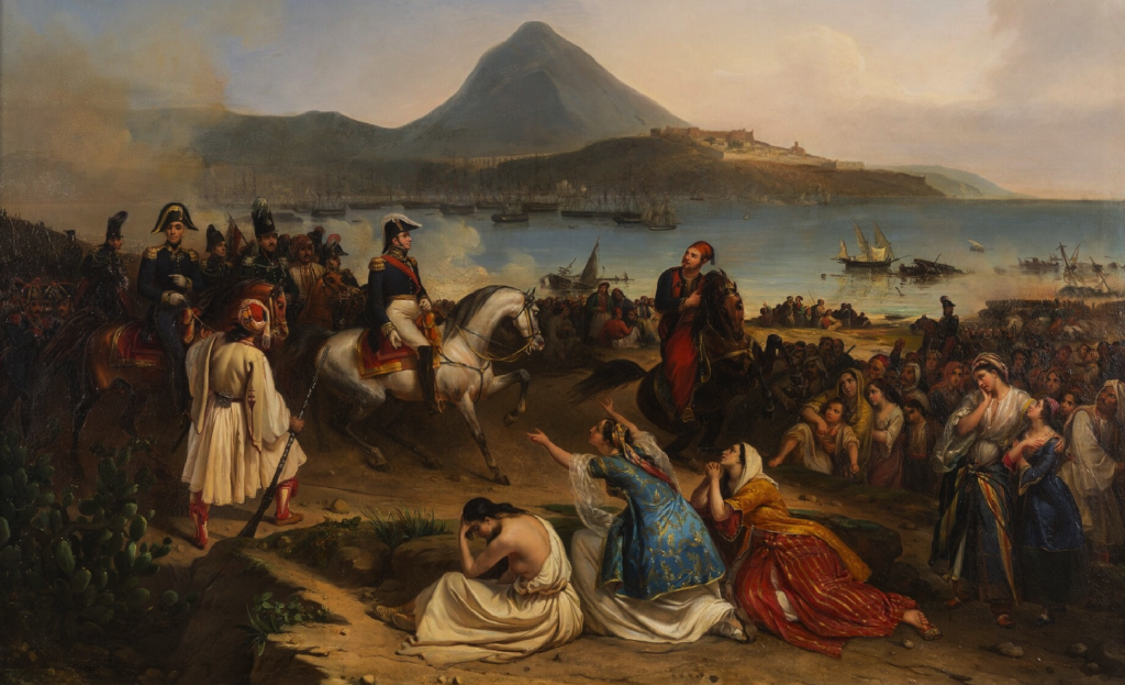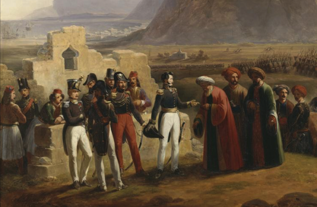 Una fuerte corriente de opinión filantrópica y filohelenística desarrollada en Occidente especialmente después de la heroica caída en 1826 de Missolonghi, donde el poeta lord Byron había muerto en 1824, muchos artistas e intelectuales como François-René de Chateaubriand, Víctor Hugo, Aleksandr Pushkin, Gioachino Rossini, Hector Berlioz o Eugène Delacroix (en sus cuadros de las Escenas de las masacres de Scio en 1824, y de Grecia sobre las ruinas de Missolonghi en 1826), amplió la corriente de simpatía por la causa griega en la opinión pública. Se decidió entonces intervenir a favor de Grecia. Por el Tratado de Londres del 6 de julio de 1827, Francia, Rusia y el Reino Unido reconocieron la autonomía de Grecia, que seguiría siendo un vasallo del Imperio otomano. Las tres potencias acordaron una intervención limitada para convencer a la Sublime Puerta de aceptar los términos del tratado. Se sugirió y adoptó una expedición de demostración naval. Una flota conjunta ruso-francesa-británica fue enviada para ejercer presión diplomática sobre Constantinopla. La batalla de Navarino, librada el 20 de octubre de 1827, resultó en la destrucción total de la flota turco-egipcia.