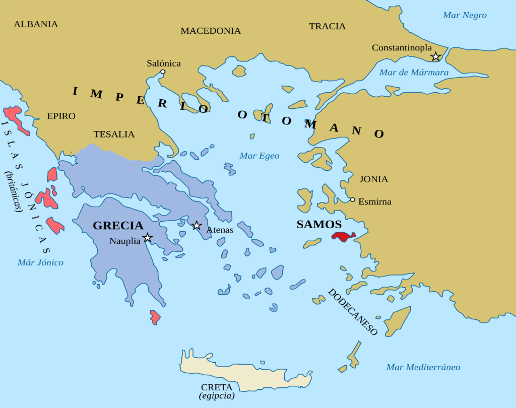 Sin embargo, fue necesaria la victoria militar de Rusia sobre Turquía en la guerra ruso-turca de 1828-29 y la firma del Tratado de Constantinopla el 21 de julio de 1832 para que las grandes potencias reconocieran y garantizaran la independencia griega. Este tratado marca el final de la Guerra de Independencia griega de 1821. Sin embargo, el territorio del nuevo Reino de Grecia solo se extiende sobre las regiones liberadas por las tropas francesas y griegas: el Peloponeso, algunas islas y la Grecia central (la frontera norte del reino está trazada a lo largo de una línea que une las ciudades de Arta y Vólos, una línea también llamada Ambracique-Pagasétique).