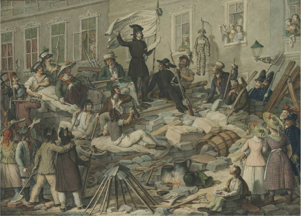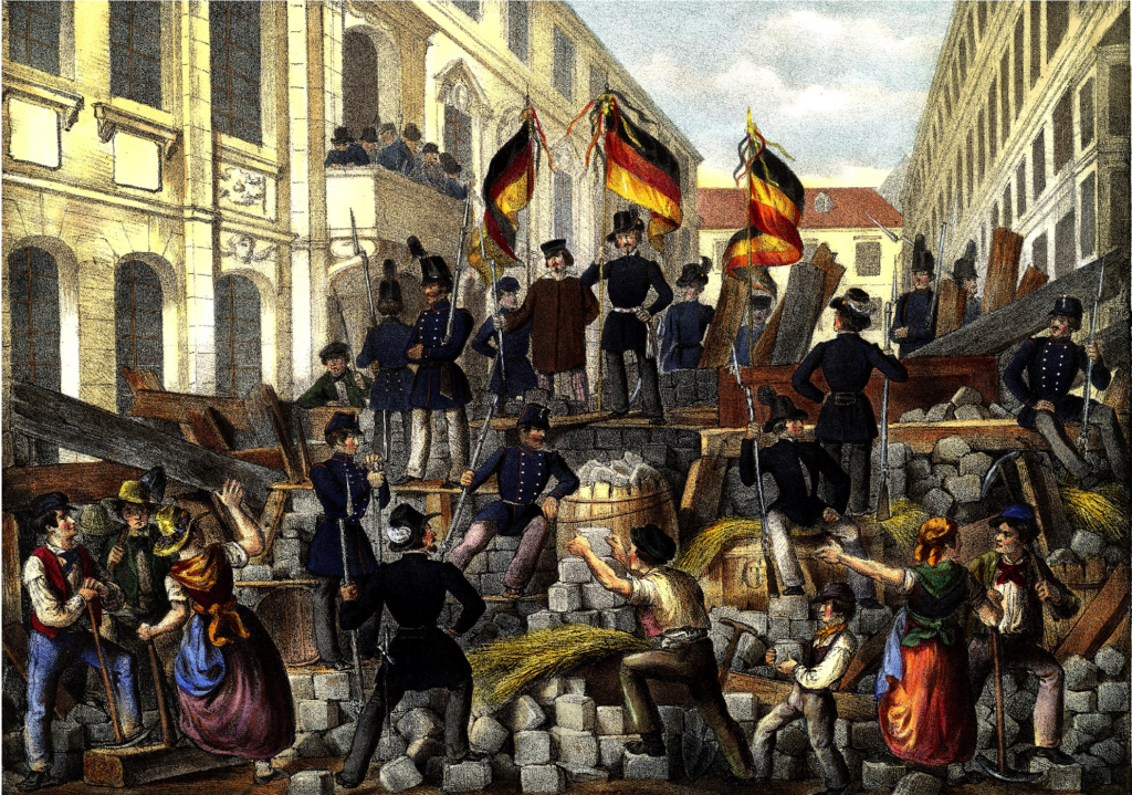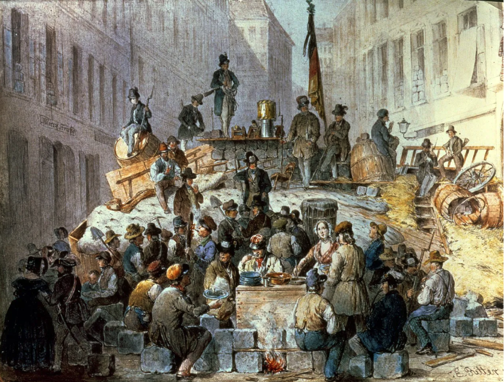 Era terrible contemplar una ciudad en proceso de transformación, de morada de paz, mercado o centro de placer, en fortaleza y campo de batalla. Mientras las mujeres transportaban estos materiales a la barricada que se alzaba. En algunos lugares donde se completaron estas barricadas, cubiertas con colchones, tras los cuales los combatientes debían agacharse mientras disparaban contra las tropas que cargaban, los estudiantes se dirigían al pueblo y arremetían contra la Camarilla y sus medidas reaccionarias; mientras sobre ellos ondeaba la bandera roja o negra, esos emblemas inequívocos de sangre y muerte.