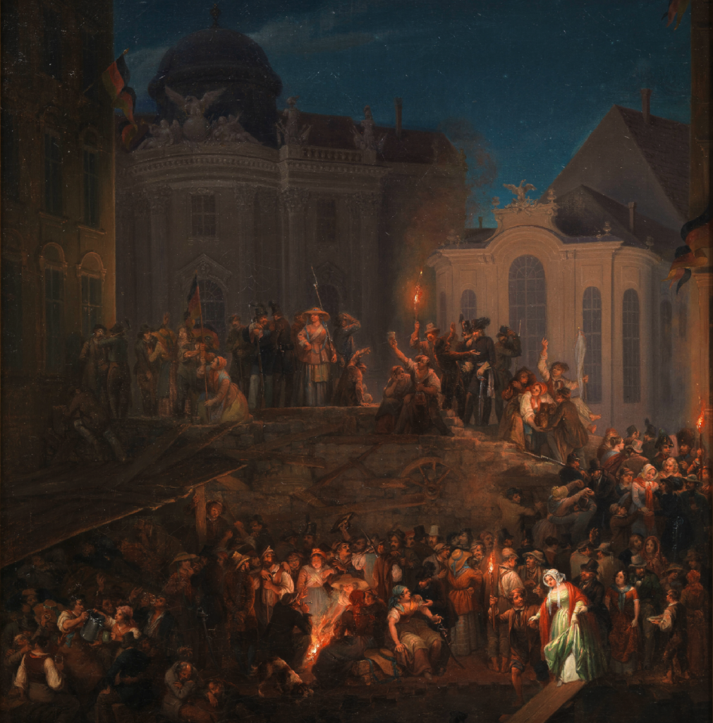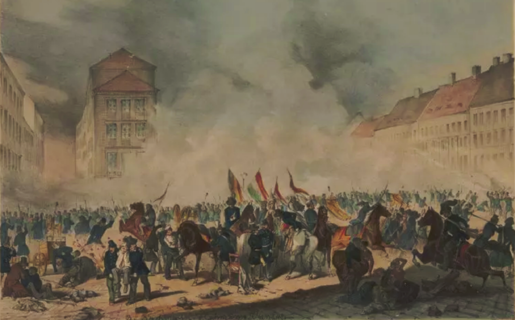 El estallido de la revolución comenzó en Viena, en marzo de 1848, inspirado por los acontecimientos en París. Los manifestantes, compuestos por estudiantes, obreros y liberales, exigieron una constitución y reformas políticas. La presión fue tan intensa que Metternich dimitió y huyó a Inglaterra. El emperador Fernando I se vio obligado a prometer una constitución y reformas liberales, aunque las tensiones continuaron en la capital, provocando nuevos levantamientos en mayo y octubre, cuando las tropas imperiales finalmente recuperaron el control de Viena.
