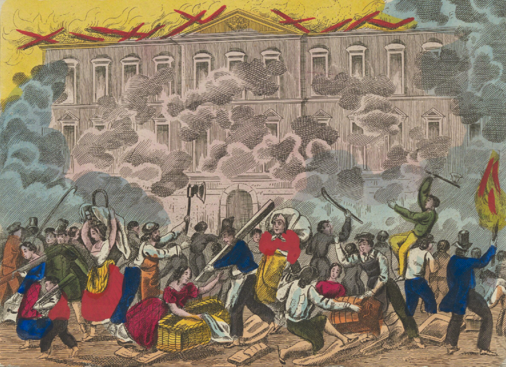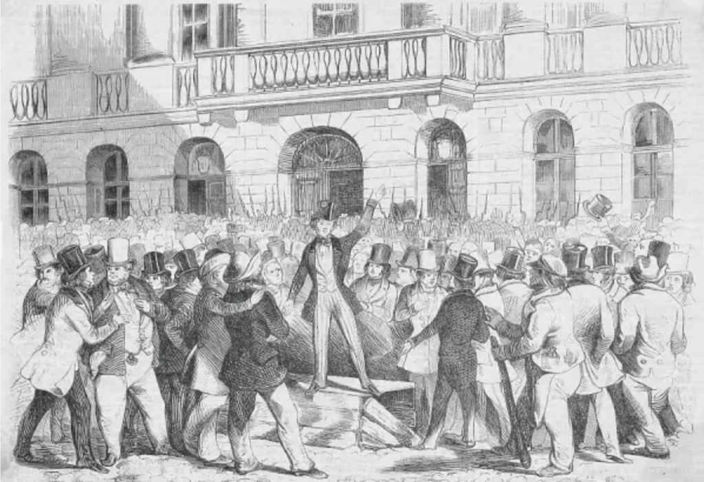 Un batallón de infantería regular avanzó entonces hasta el lugar y rodeó el edificio. Los estudiantes, impasibles ante estas manifestaciones, saludaron a las tropas con gritos fraternales a medida que aparecían; y la multitud, atraída por el ruido y la curiosidad de presenciar el cierre de la universidad, aumentaba de un momento a otro e impedía cualquier operación de las tropas, por lo que los comandantes consideraron conveniente su retirada. La agitación aumentó, se tocó el rápel, se tocó la campana y treinta mil obreros de los arrabales, a instancias de los estudiantes, armados con hachas, palas y barras de hierro, acudieron al lugar. Las puertas de la ciudad estaban ocupadas por el ejército regular y parcialmente cerradas.