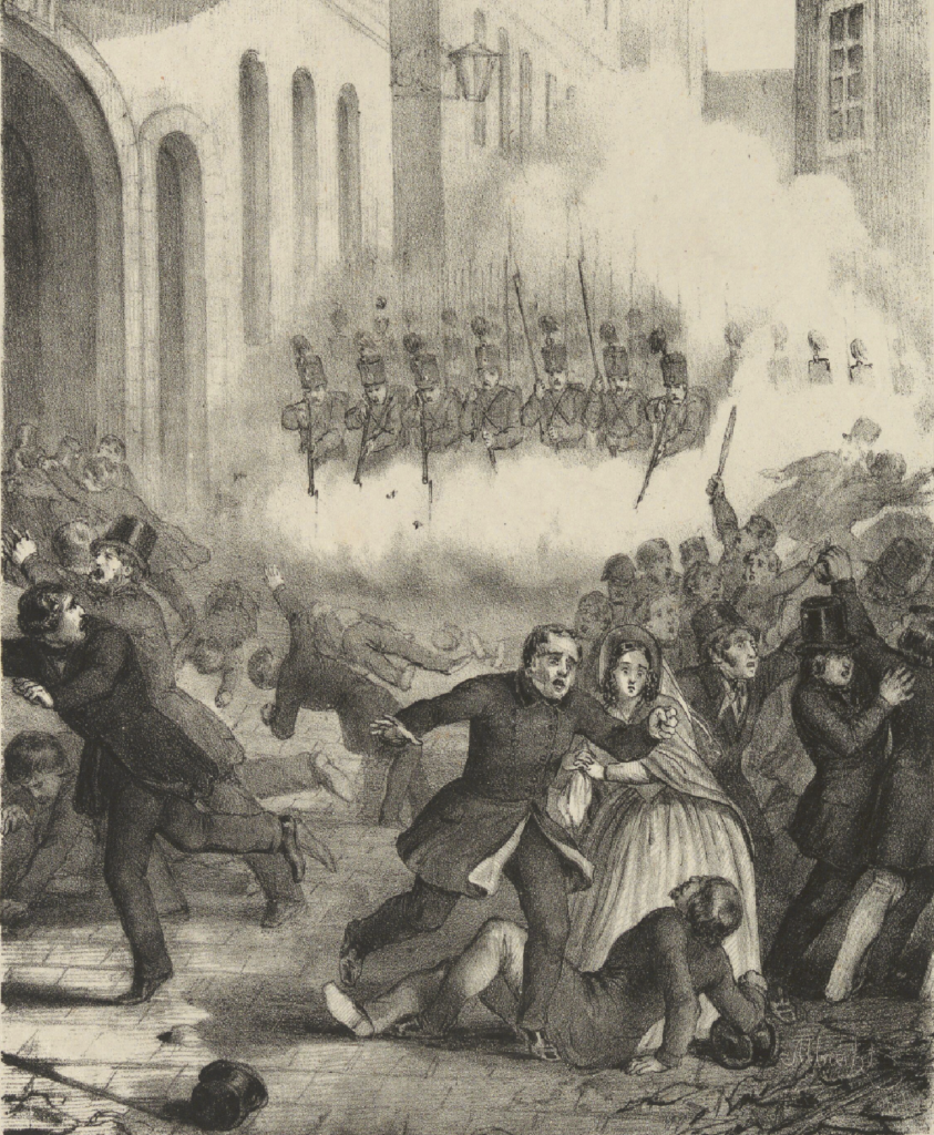 Mientras estos acontecimientos se desarrollaban, los soldados se retiraron a las plazas públicas y allí esperaron, con las armas cargadas y con impaciencia, la orden de cargar contra las barricadas.