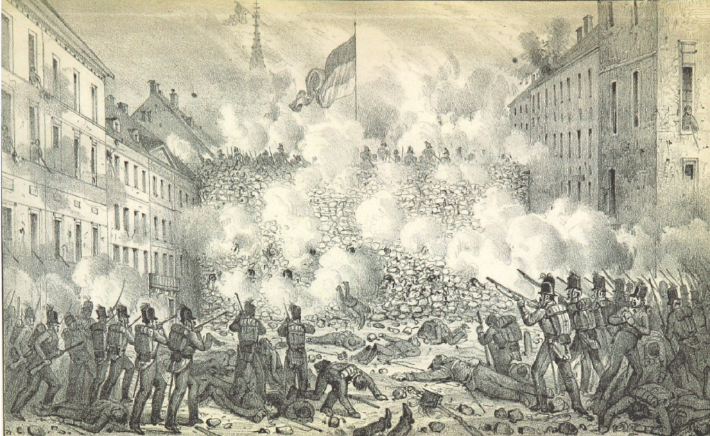 Durante toda la noche, los estudiantes, la Guardia Nacional y los obreros permanecieron en las barricadas. Se hicieron fogatas en medio de las calles; estudiantes con sus sombreros y plumas calabreses, guardias nacionales con sus gorras con yelmo, obreros sin abrigo y campesinas sin cofias sentados sobre los adoquines alrededor de hogueras se entregaban a bromas, risas o canciones. Era un espectáculo extraño y doloroso ver estos campamentos en el corazón de una ciudad.
