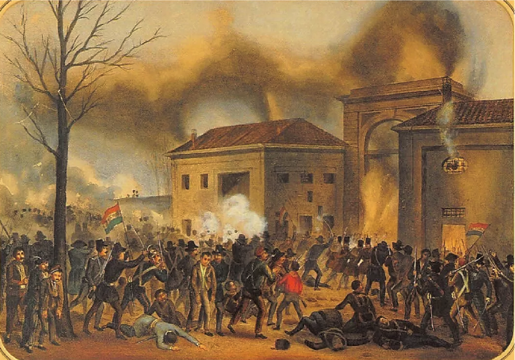 «¡Hombres armados a las ventanas!» gritó, y en cada una de las ventanas del primer piso que daban a la calle, de donde provenía la columna atacante, se posicionaron los insurgentes armados con mosquetes. De los hombres desarmados, unos 60, incluyendo a muchos impresores, que desde la una de la mañana habían estado construyendo incansablemente barricadas en diversos puntos de la ciudad, corrieron a los tejados. Los disparos que salían de las ventanas y la terrible tormenta de tejas que caían de los tejados pronto imposibilitaron el avance de la columna atacante.
