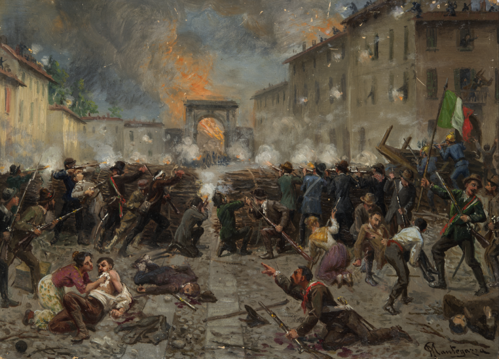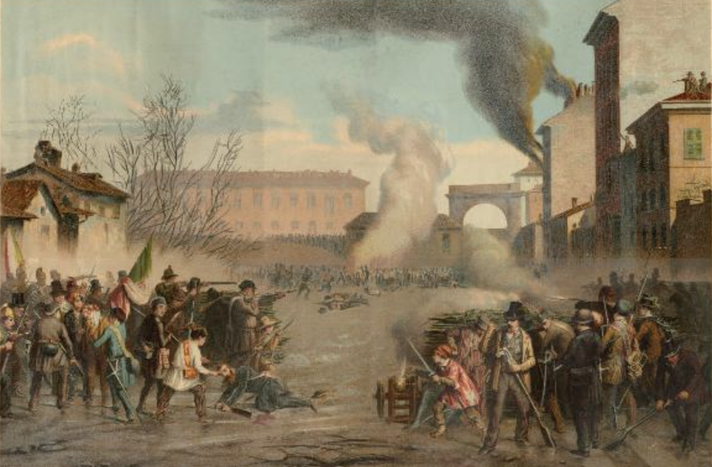 Ataque insurgente a la puerta Tosa en Milán el 22 de marzo de 1848. Se aprecia la barricada móvil. Autor Giacomo Mantegazza.