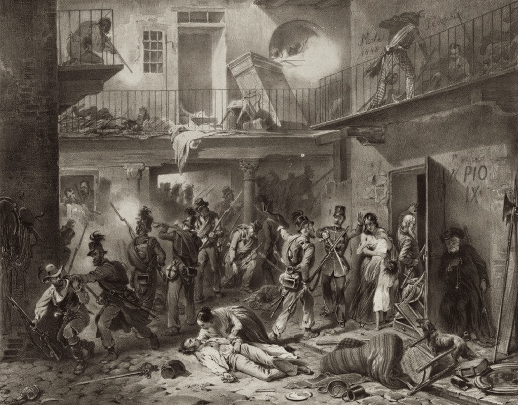Combate en un patio entre insurgentes milaneses y los cazadores tiroleses el 19 de marzo de 1848. Autor Franz y Eugen Adam.