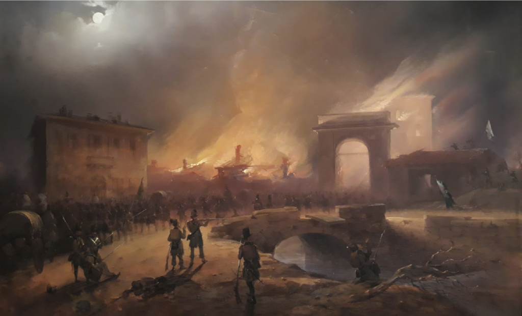 A las diez de la noche, el ejército austriaco abandonó el Castillo, donde altas llamas iluminan la escena. El aire se llena con el rugido de la artillería y el incesante tañido de las campanas. Altas columnas de humo se elevan junto con el resplandor de las hogueras.