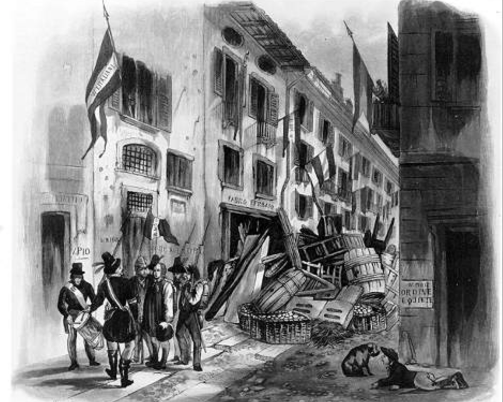 Revuelta de las Cinco Jornadas de Milán (18 al 22 de marzo de 1848). Barricada erigida por los insurgentes para bloquear una calle y los defensores de la misma armados.­