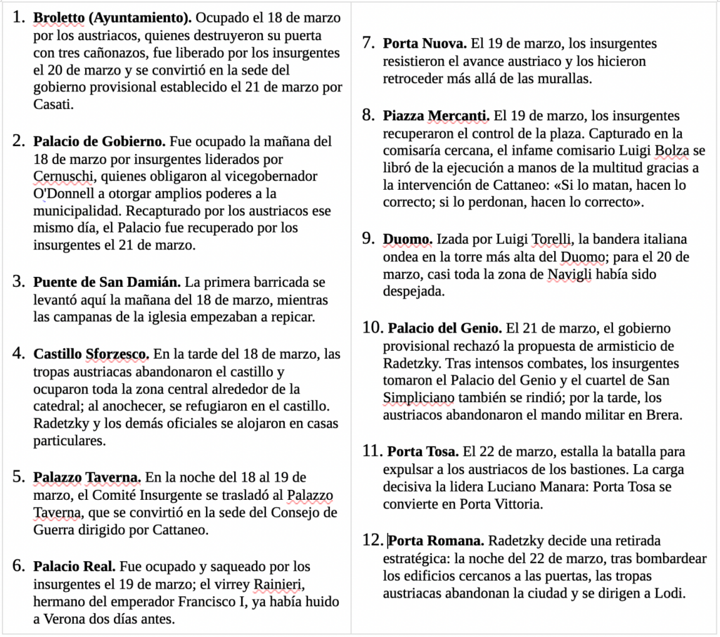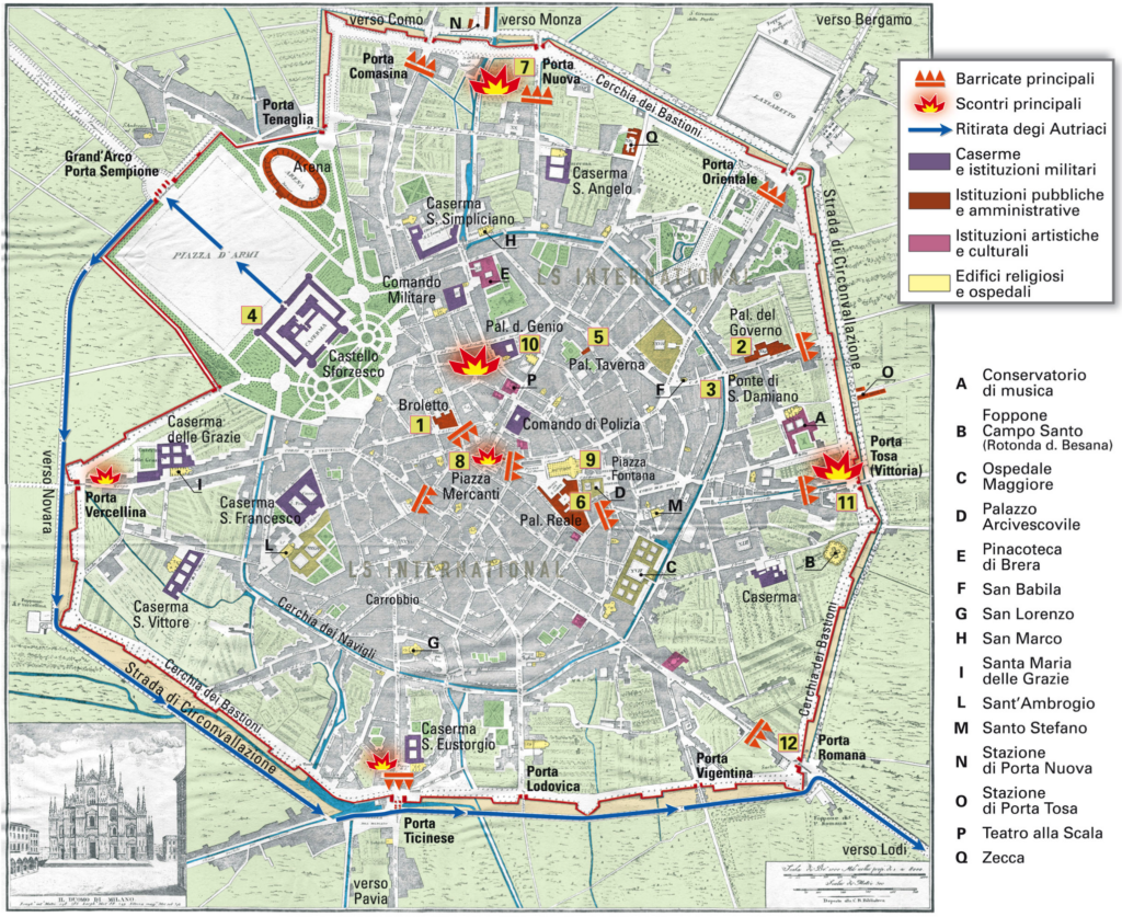 Revuelta de las Cinco Jornadas de Milán (18 al 22 de marzo de 1848). Plano de la ciudad con incidentes.