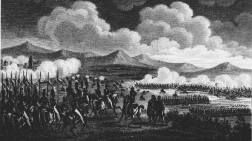 El general aceleró el trote y pronto llegó a la presencia del enemigo, al que encontró ya en la llanura, fuera del pueblo, y presentando siete escuadrones o divisiones escalonados y cubiertos por una línea de escaramuzadores: un grupo de oficiales avanzaba en actitud amenazante.